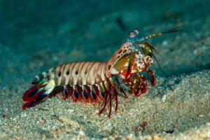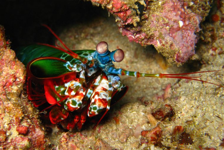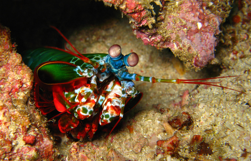 Se il colpo è devastante, la vista del gambero mantide è semplicemente fuori scala. I suoi occhi composti non si limitano a rilevare i tre canali di colore tipici dell’essere umano (rosso, verde e blu), ma arrivano fino a otto recettori cromatici, forse anche di più.